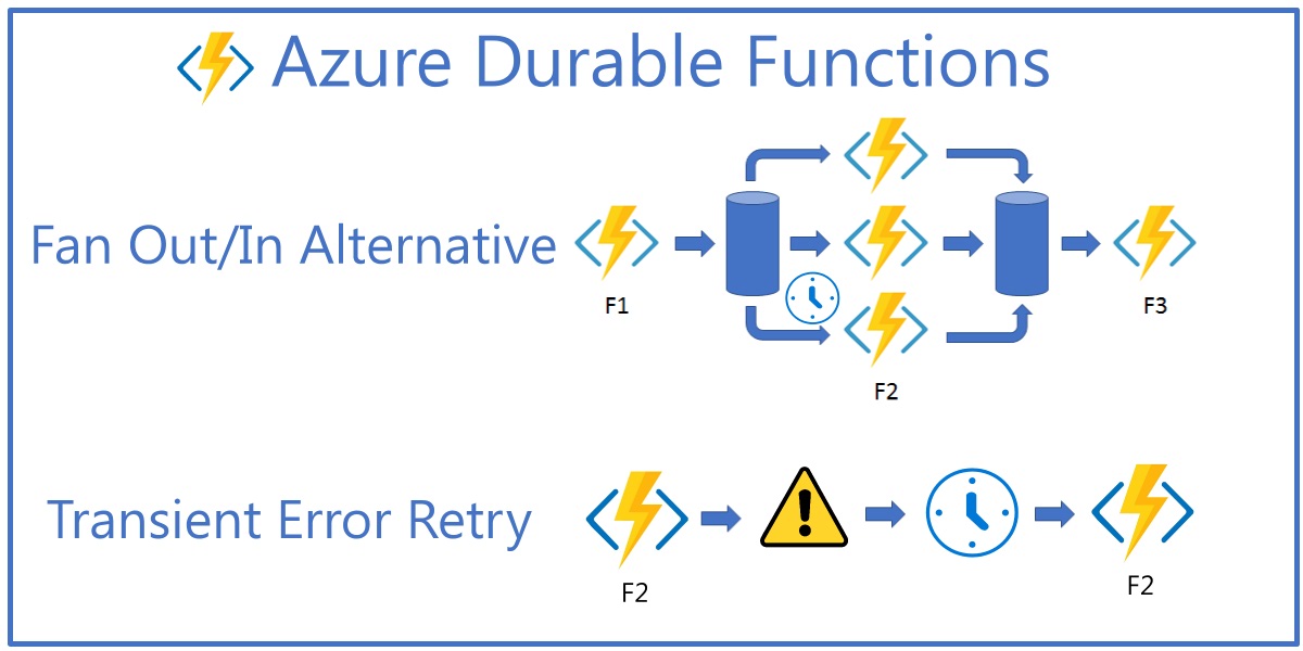 - Transient error handling via orchestration with durable timer backoff and orchestration replay using ContinueAsNew